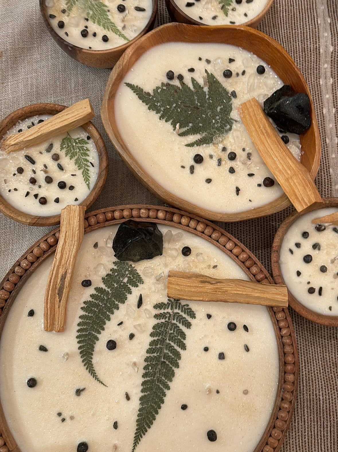 All candles are thoughtfully designed with sustainability in mind. Made entirely from natural materials including pure essential oils, cotton wicks, mica shimmer, and genuine crystals and botanicals, each hand carved wooden vessel is intended for reuse, offering new purpose long after the flame has faded.
