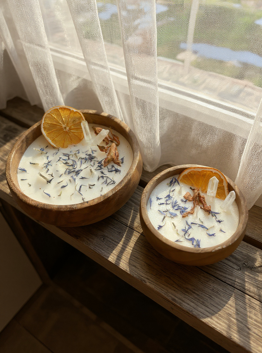 All candles are thoughtfully designed with sustainability in mind. Made entirely from natural materials including pure essential oils, cotton wicks, mica shimmer, and genuine crystals and botanicals, each hand carved wooden vessel is intended for reuse, offering new purpose long after the flame has faded.