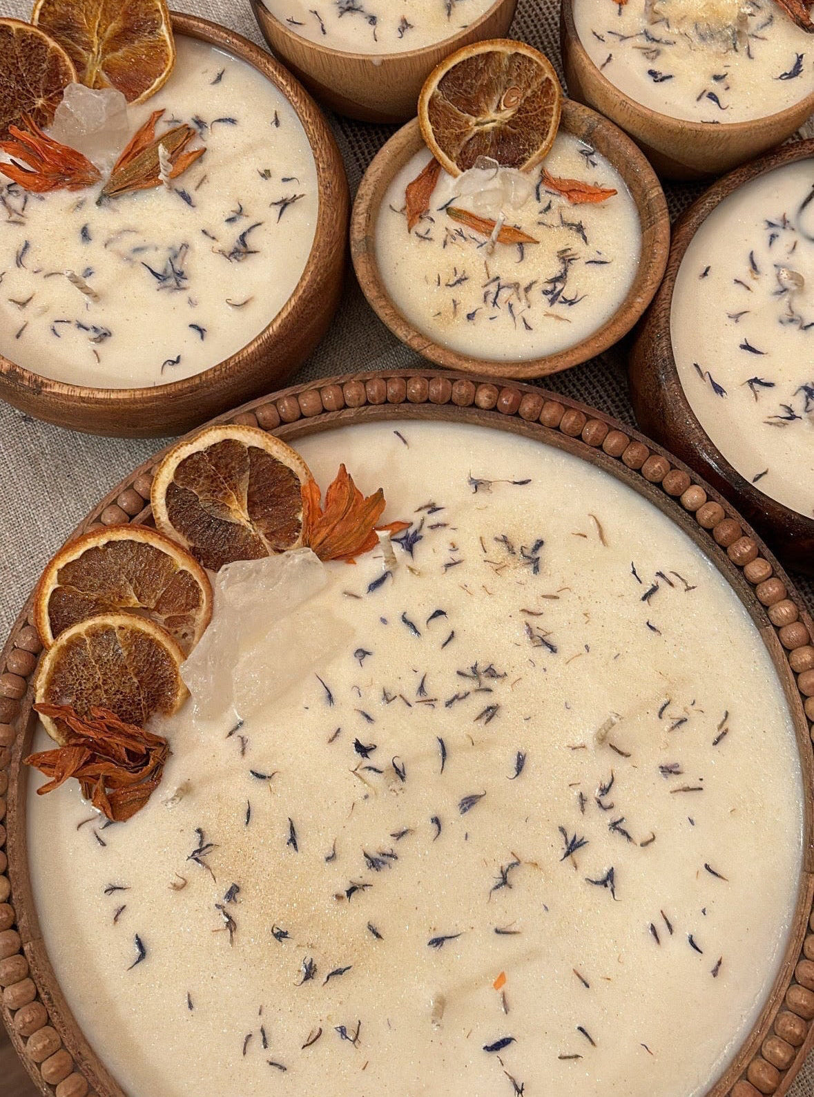 Adorned with dried orange slices, blue cornflower petals, clear quartz, and dried orange lilies, this candle invites both peace and heightened intuition. The botanicals were chosen to encourage emotional healing and strengthen connection to higher guidance through rest and imagination.